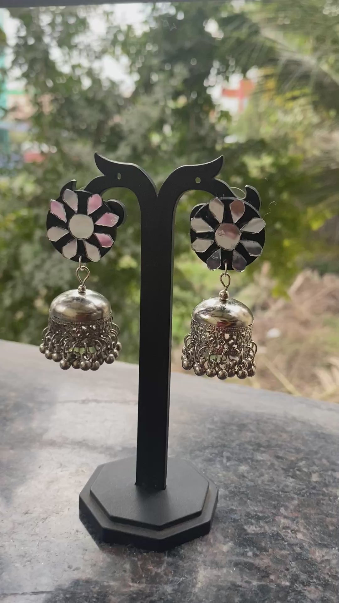 These are Mirror-Work Oxidized Jhumkas, a popular style of traditional Indian jewelry that blends rustic charm with festive elegance.