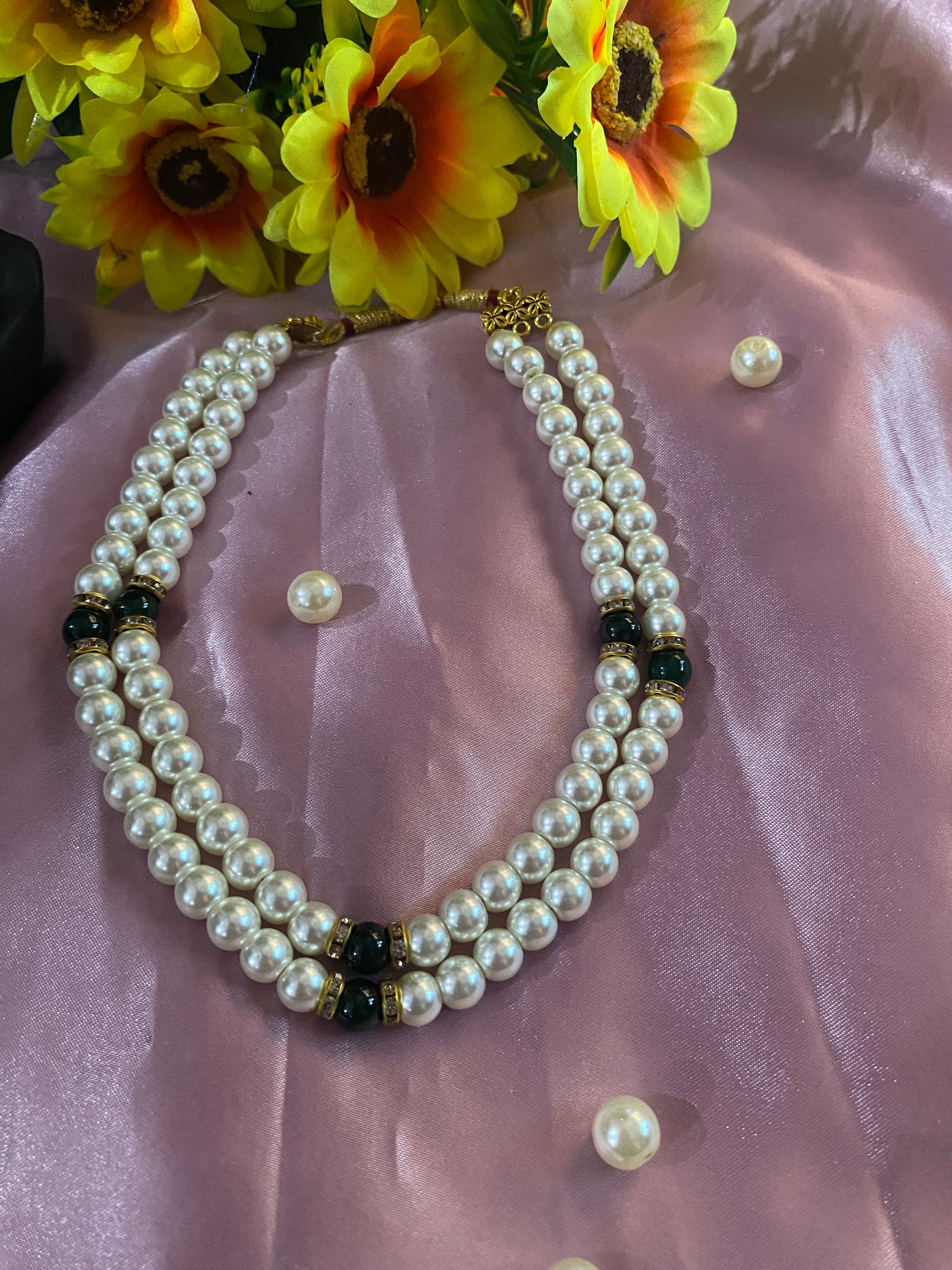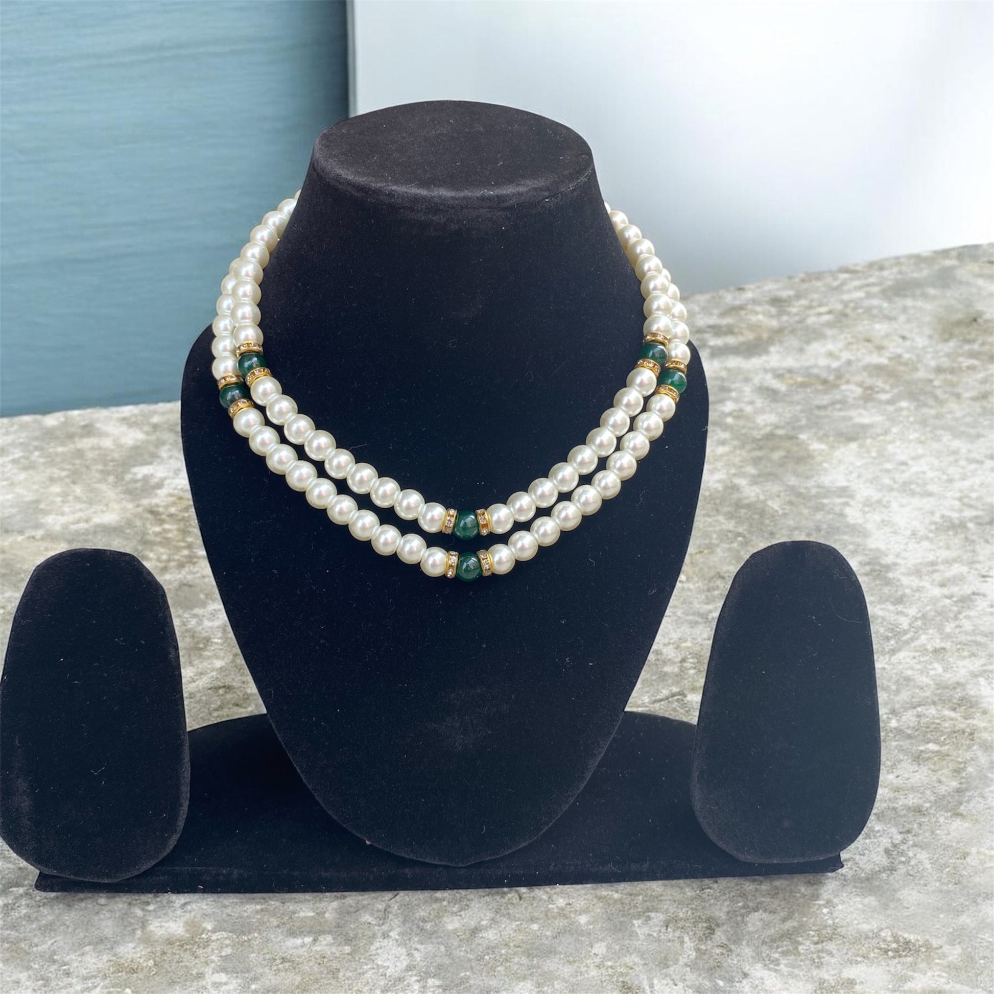 • Accents: The two strands are enhanced with deep green cylindrical or barrel-shaped beads (possibly synthetic stones or glass), which provide a lovely contrast to the white pearls.